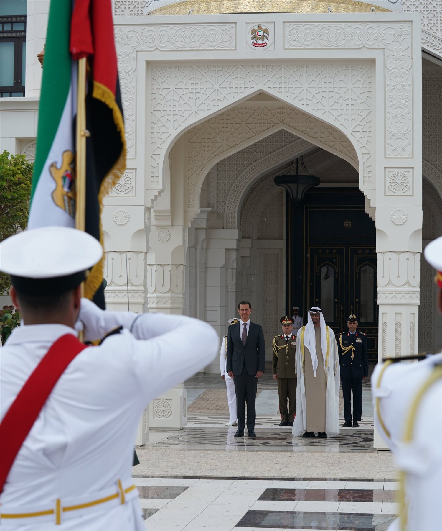وكان في استقبال الرئيس السوري لدى وصوله إلى مطار الرئاسة في أبوظبي، الشيخ محمد بن زايد آل نهيان، رئيس دولة الإمارات العربية المتحدة.