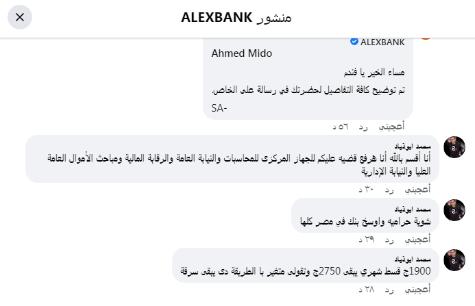 قال أحد عملاء بنك الاسكندرية في تعليق عبر صفحة المصرف الرسمية على موقع "فيسبوك"،: "أنا أقسم بالله أنا هرفع قضية عليكم للجهاز المركزى للمحاسبات والنيابة العامة والرقابة المالية ومباحث الأموال العامة العليا والنيابة الإدارية".