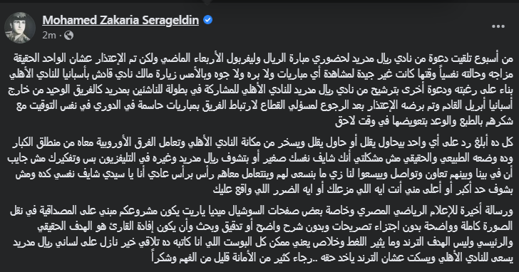وأختتم:" ورسالة أخيرة للإعلام الرياضي المصري وخاصة بعض صفحات السوشيال ميديا ياريت يكون مشروعكم مبني على المصداقية في نقل الصورة كاملة وواضحة بدون اجتزاء تصريحات وبدون شرح واضح أو تدقيق وبحث وأن يكون إفادة القارئ هو الهدف الحقيقي والرئيسي وليس الهدف الترند وما يثير اللغط وخلاص يعني ممكن كل البوست اللي انا كاتبه ده تلاقي خير نازل على لساني ريال مدريد يسعى للنادي الأهلي ويسكت عشان الترند ياخد حقه، رجاء كثير من الأمانة قليل من الفهم وشكراً".