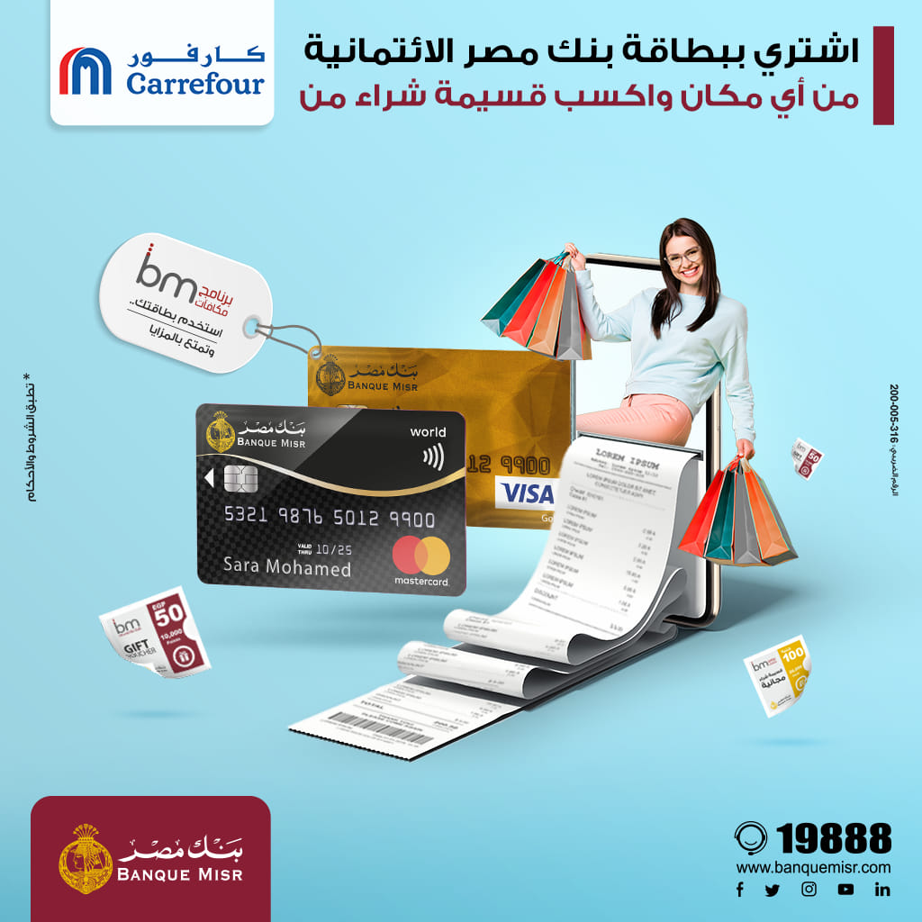 نشر بنك مصر عبر صفحته الرسمية على موقع "فيسبوك"،: "اشتري كل اللي نفسك فيه من أي مكان ببطاقة بنك مصر الائتمانية وهتكسب قسيمة شراء هدية تستخدمها لمشتريات رمضان في كارفور".