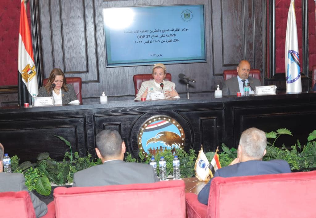 واستعرضت الوزيرة الجهود التي تقوم بها مصر والشوط الكبير الذي قطعته في مواجهة تغير المناخ حيث تم تشكيل لجنة برئاسة رئيس الوزراء تضم ممثلين من كافة الوزارات لتوحيد الجهود والتحركات بشأن قضية الاحتباس الحراري كما لفتت إلى نجاح مصر في تنظيم قمة المناخ رغم دقة التوقيت الذي انعقدت فيه القمة بسبب مرور العالم بأزمات متلاحقة منها جائحة كورونا وعدد من التحديات السياسية والاقتصادية وفي مجال الطاقة والمياة حيث بدأ التحضير بتحويل مدينة شرم الشيخ مدينة خضراء، وتغيير منظومة الطاقة بها للعمل بالطاقة الجديدة والمتجددة في معظم الفنادق وتحويل وسائل النقل والأتوبيسات للعمل بالكهرباء أو الغاز الطبيعي، بالإضافة إلى بناء منظومة جديدة لإدارة المخلفات الصلبة البلدية ورفع كفاءة المحميات الطبيعية، كما تم منح الفنادق المتوافقة بيئيا العلامة الخضراء، ومنح الزعنفة الخضراء لمراكز الغوص. كما أن الدولة المصرية حققت اختراق كبير تمثل في الاتفاق على انشاء صندوق للأضرار والخسائر لتعويض الدول المتضررة من الغازات والانبعاثات الحرارية بالإضافة لقدرة مصر على تحقيق توافق دولي حول التزام القوى الصناعية الكبرى في مجال التعاون البيئي.
