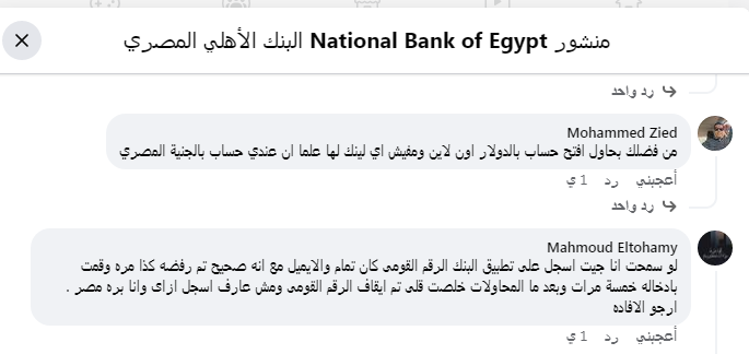قال أحد عملاء البنك الاهلى المصرى في تعليق عبر صفحة المصرف الرسمية على موقع "فيسبوك"،: "لو سمحت انا جيت اسجل على تطبيق البنك الرقم القومى كان تمام والايميل مع انه صحيح تم رفضه كذا مرة وقمت بادخالة خمسة مرات وبعد ما المحاولات خلصت قلى تم إيقاف الرقم القومى ومش عارف اسجل إزاى وأنا بره مصر.. أرجو الإفادة".