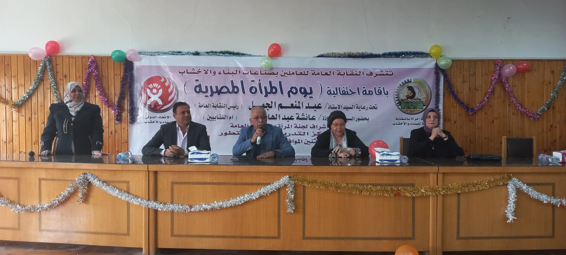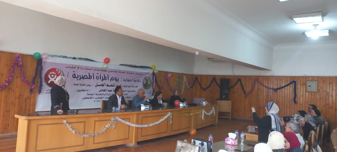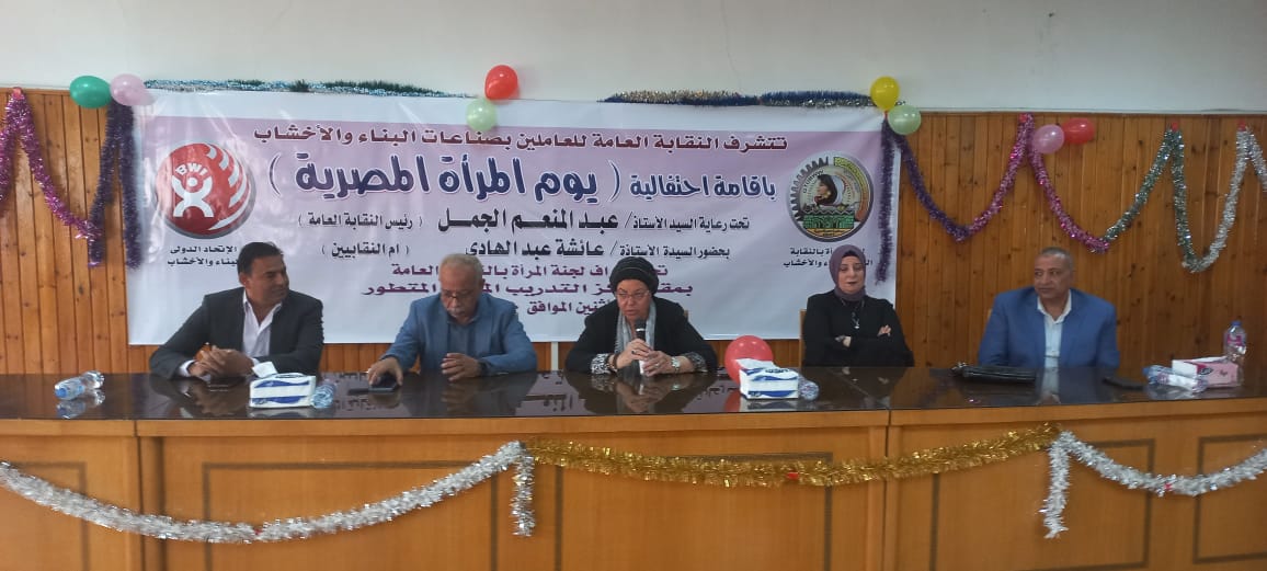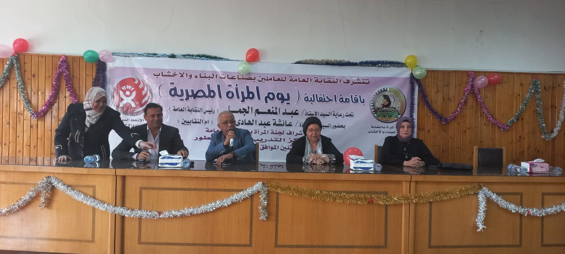أقامت النقابة العامة للعاملين بالبناء والأخشاب، برئاسة عبد المنعم الجمل، نائب رئيس الاتحاد العام لنقابات عمال مصر، احتفالية بمناسبة يوم المرأة المصرية، تحت إشراف أمانة المرأة بالنقابة، بحضور عائشة عبد الهادي، وزيرة القوى العاملة والهجرة السابقة.