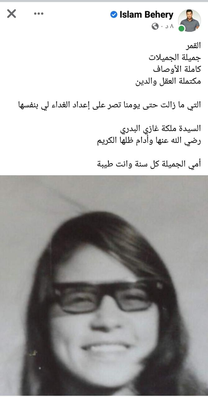 وكتب بحيري على صفحته الرسمية بموقع التواصل الاجتماعي فيس بوك، معلقًا على صورة السيدة والدته، قائلًا: «القمر.. جميلة الجميلات.. كاملة الأوصاف.. مكتملة العقل والدين.. التي ما زالت حتى يومنا تصر على إعداد الغداء لي بنفسها.. السيدة ملكة غازي البدري رضي الله عنها وأدام ظلها الكريم.. أمي الجميلة كل سنة وأنتِ طيبة».