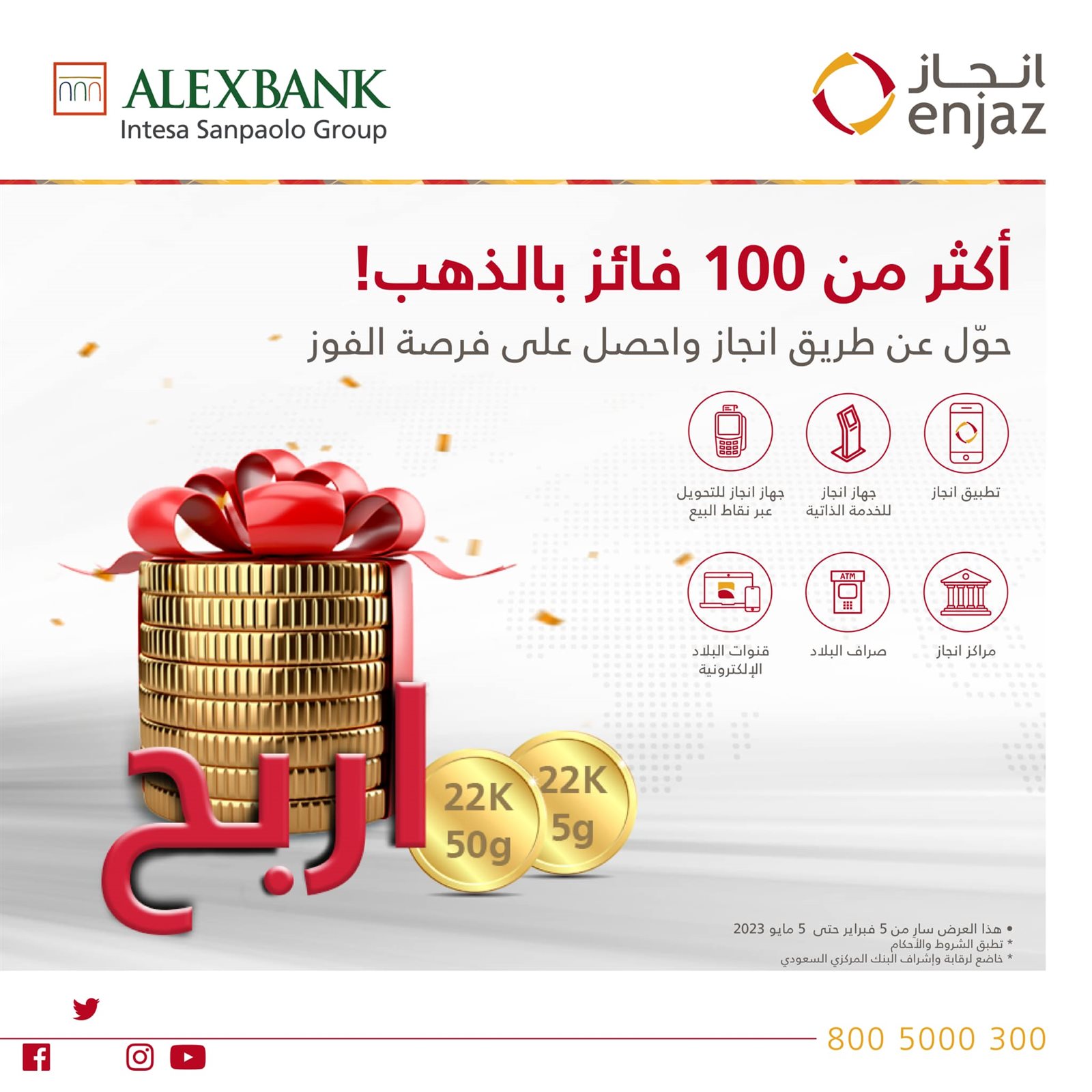 نشر بنك الاسكندرية عبر صفحته الرسمية على موقع "فيسبوك"،: "لكل المصريين في السعودية، حول دلوقتي لأهلك في مصر على بنك الإسكندرية من خلال فروع انجاز وقنوات انجاز الالكترونية وممكن تكون ضمن 100 فائز بجنيهات ذهب يصل وزنها الى 50 جرام".