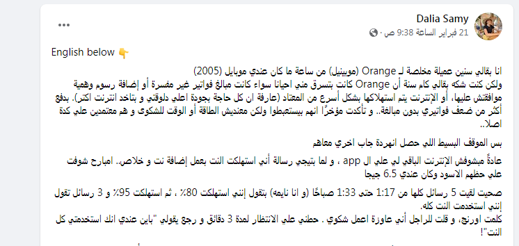 وأضافت: "لكن كنت شكه بقالي كام سنة أن Orange كانت بتسرق مني أيانا سواء كانت مبالغ فواتير غير مفسرة أو إضافة رسوم وهمية موافقتش عليها، أو الإنترنت يتم استهلاكها بشكل أسرع من المعتاد (عارفة ان كل حاجة بجودة اعلي دلوقتي و بتاخد انترنت اكتر). بدفع أكثر من ضعف فواتيري بدون مبالغة.. و تأكدت مؤخرًا انهم بيستعبطوا ولكن معنديش الطاقة أو الوقت للشكوى وهم معتمدين على كده أصلا".