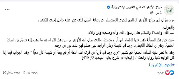 كشف مركز الأزهر للفتوى الإلكترونية، ديانة الطفل شنودة الذي عثر عليه داخل كنيسة، مؤكدا أن الأمر فيه آراء متعددة للعلماء.