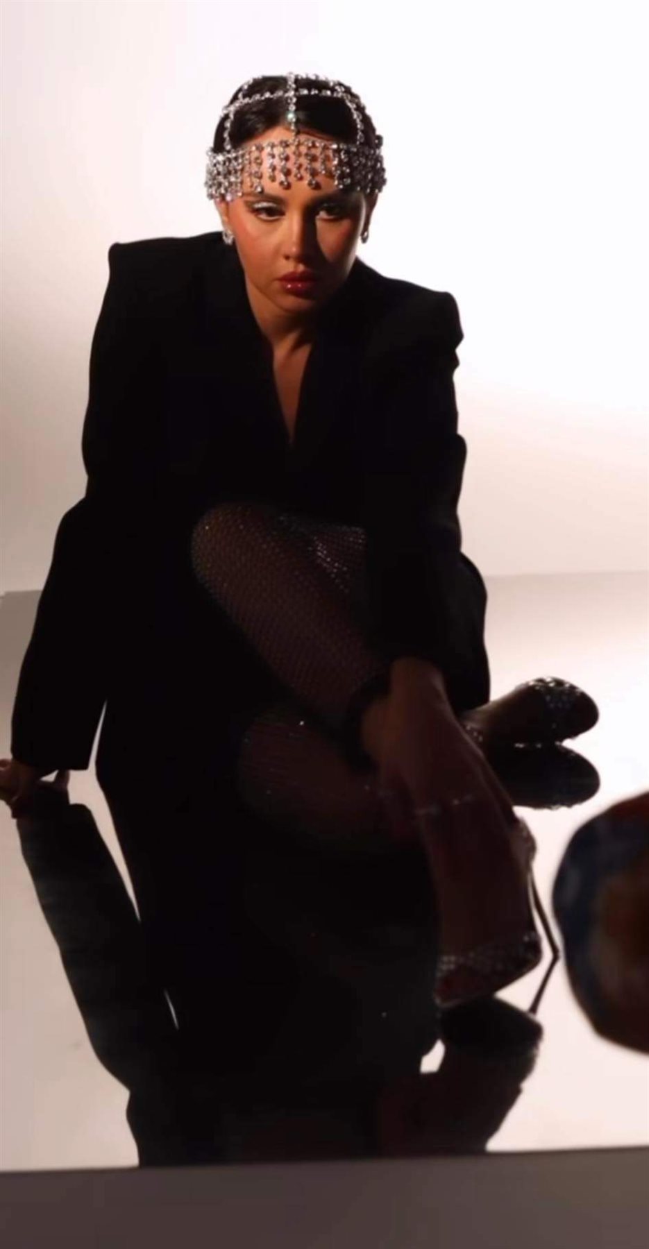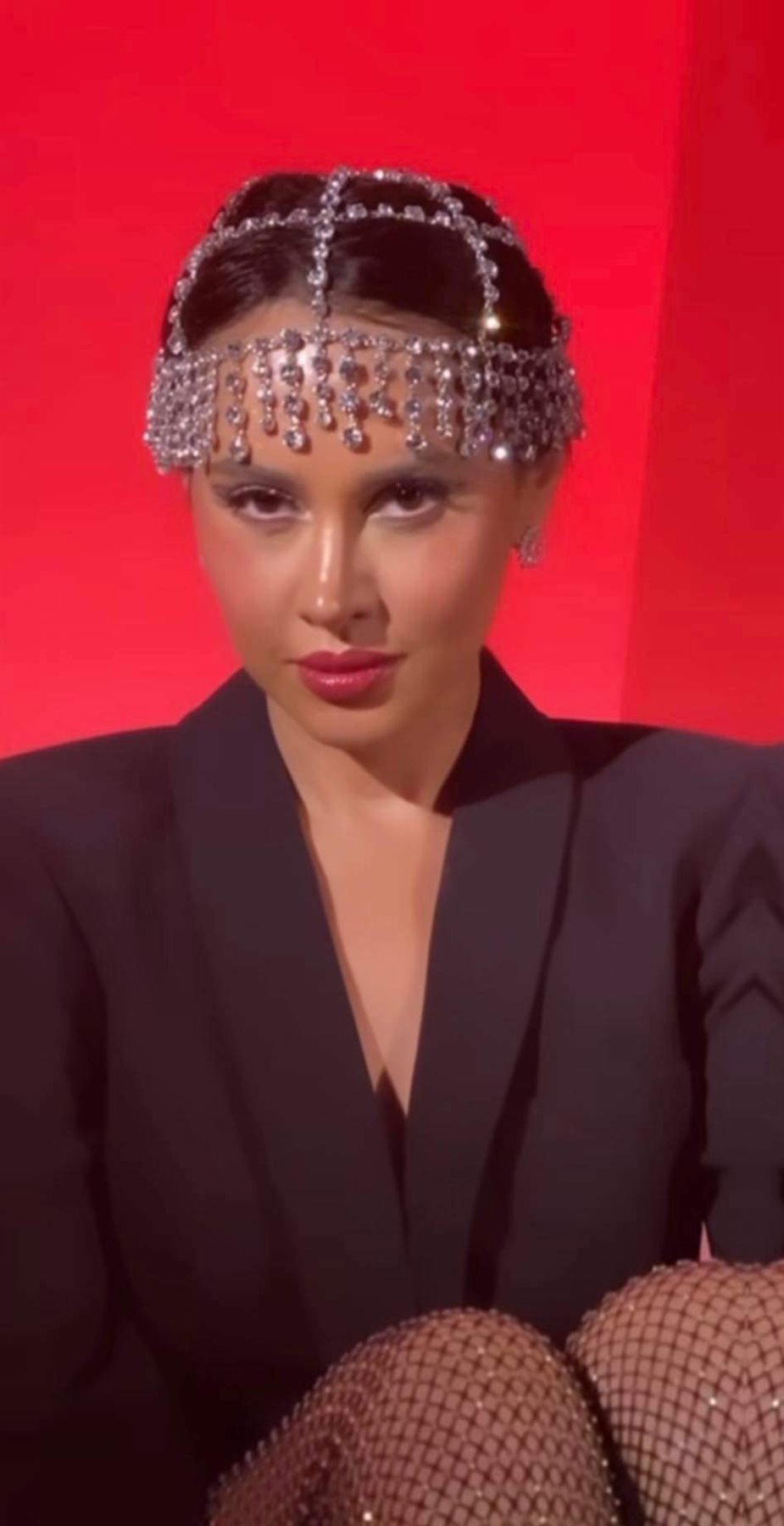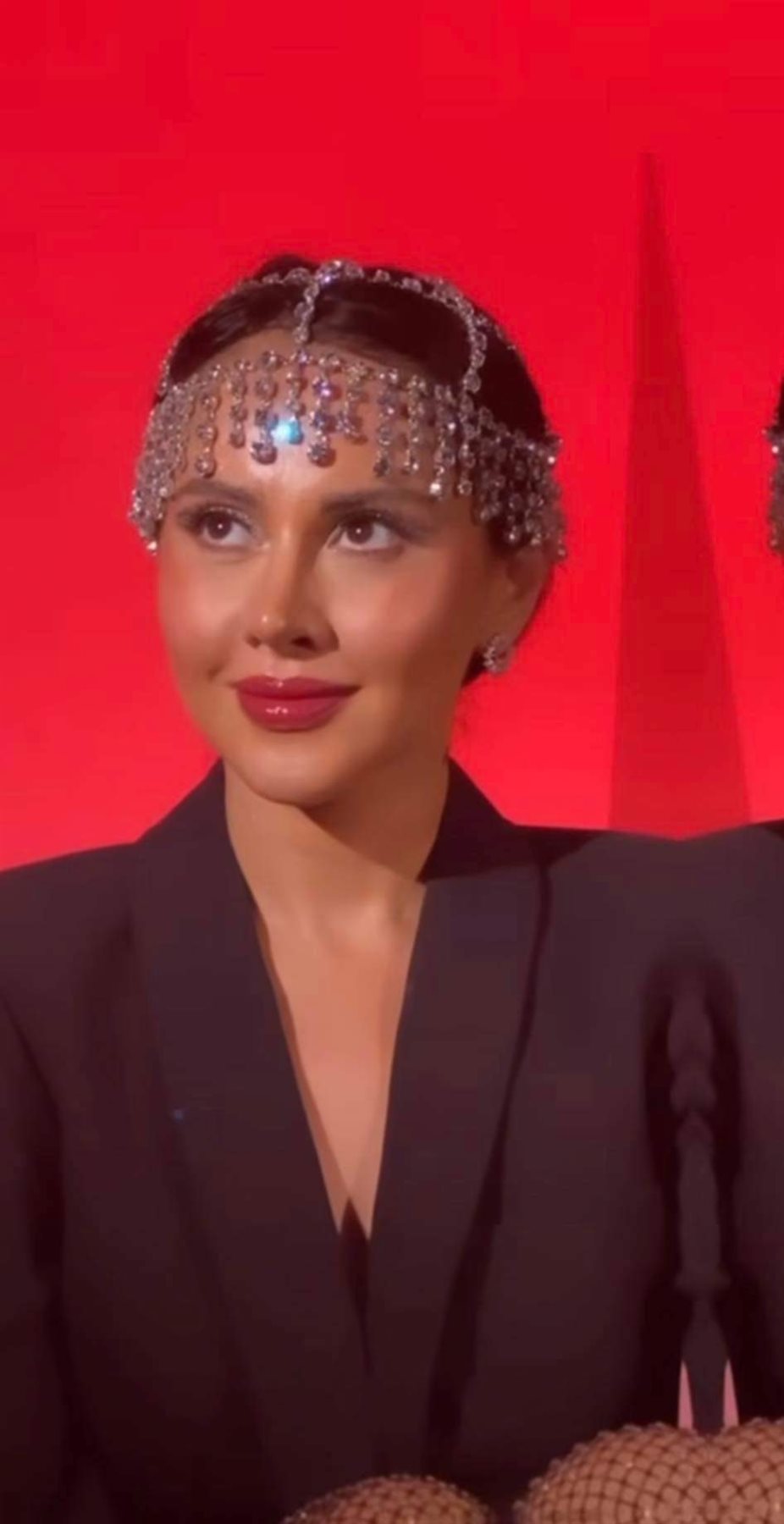 وظهرت ياسمين رئيس بطوق مرصع لامع، بالإضافة إلى جوارب شبكية لامعة وهيلز فضي.