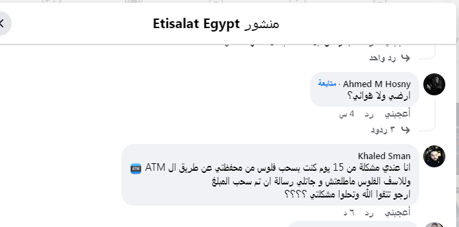 وقال أحد عملاء اتصالات مصر في تعليق عبر صفحة المصرف الرسمية على موقع "فيسبوك"،: "أنا عندي مشكلة من 15 يوم كنت بسحب فلوس من محفظتي عن طريق الـ ATM".