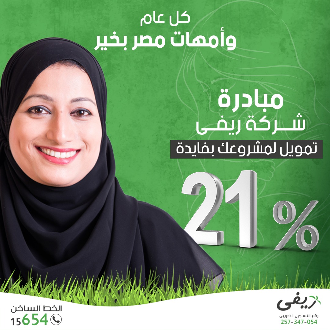 نشرت شركة ريفى لتمويل المشروعات عبر صفحتها على موقع "فيسبوك"،: " كل عام وأمهات مصر كلهم بخير بمناسبة عيد الأم، شركة ريفى بتقدم مبادرة حصرية لكل السيدات.. لمدة اسبوع فقط، تمويل مشروعك بأقل فايدة فى مصر 21%".