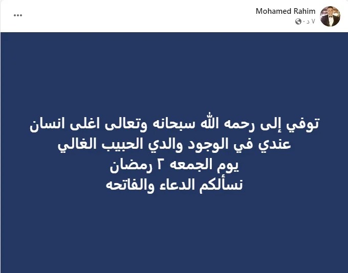 وكتب محمد رحيم عبر منشور في فيسبوك: توفي إلى رحمة الله سبحانه وتعالى أغلى إنسان عندي في الوجود والدي الحبيب الغالي.. يوم الجمعة 2 رمضان.. نسألكم الدعاء والفاتحة.