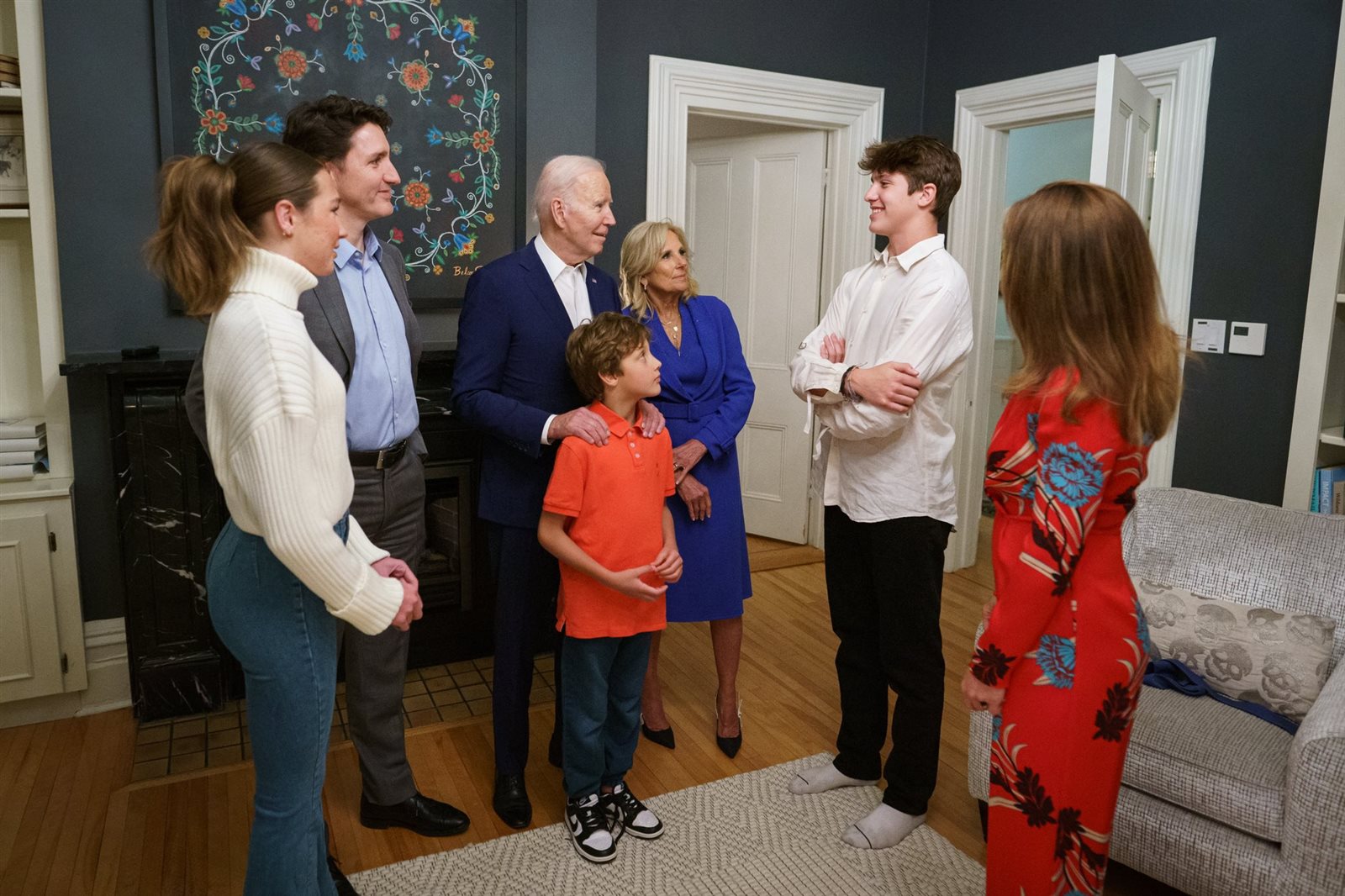 وظهر نجل ترودو الأكبر كزافييه دون حذاء ومرتديا جوارب متسخة، خلال استقبال بايدن وزوجته جيل فى منزل والديه.