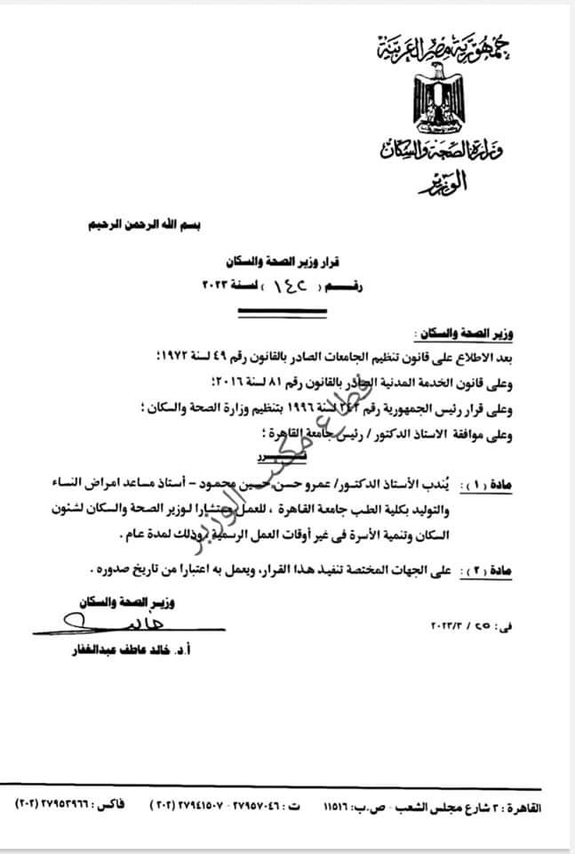 القرار، الذي حمل رقم 142 لسنة 2023، على ندب الدكتور عمرو حسن حسين محمود، أستاذ مساعد النساء والتوليد بكلية الطب جامعة القاهرة، للعمل مستشاراً لوزير الصحة والسكان لشؤون السكان وتنمية الأسرة في غير أوقات العمل الرسمية، وذلك لمدة عام.