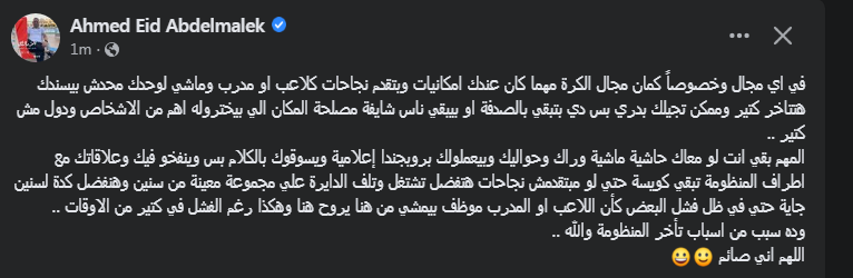 وكتب عبر حسابه الرسمي"فيسبوك":" في اي مجال وخصوصاً كمان مجال الكرة مهما كان عندك امكانيات وبتقدم نجاحات كلاعب أو مدرب وماشي لوحدك محدش بيسندك هتتاخر كتير، وممكن تجيلك بدري بس دي بتبقي بالصدفة او بيبقي ناس شايفة مصلحة المكان الي بيختروله اهم من الاشخاص ودول مش كتير".