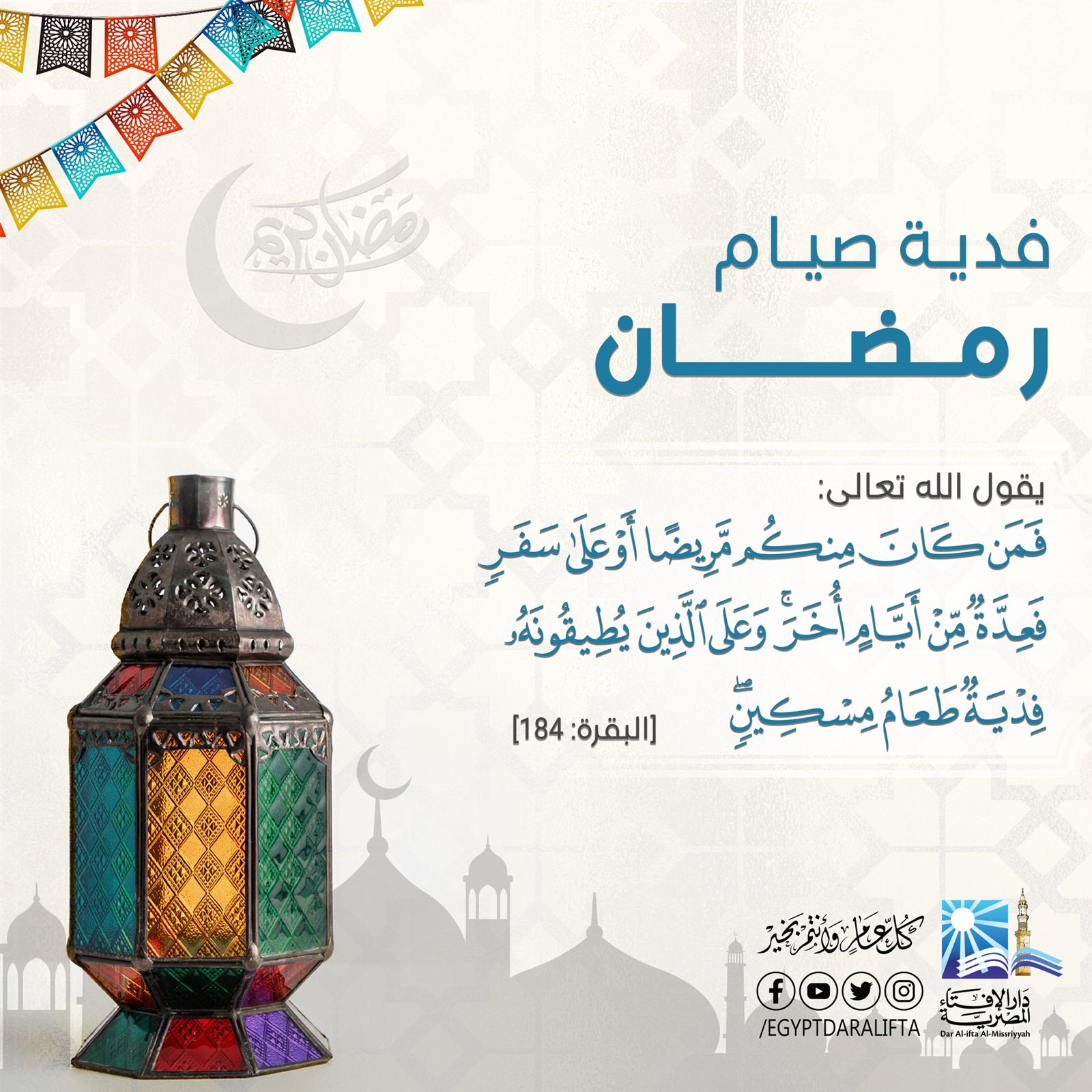 وقالت دار الإفتاء: إن فدية صيام شهر رمضان المعظم شرعت بقول الله تعالى: «فَمَن كَانَ مِنكُم مَّرِيضًا أَوْ عَلَىٰ سَفَرٍ فَعِدَّةٌ مِّنْ أَيَّامٍ أُخَرَ وَعَلَى الَّذِينَ يُطِيقُونَهُ فِدْيَةٌ طَعَامُ مِسْكِينٍ» (البقرة: 184).