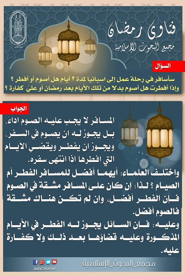 جاء ذلك خلال رد مجمع البحوث الإسلامية، على سؤال يقول فيه السائل: سأسافر في رحلة عمل إلى أسبانيا لمدة 3 أيام هل أصوم أم أفطر؟ وإذا أفطرت هل أصوم بدلًا من تلك الأيام بعد رمضان أم عليّ كفارة؟