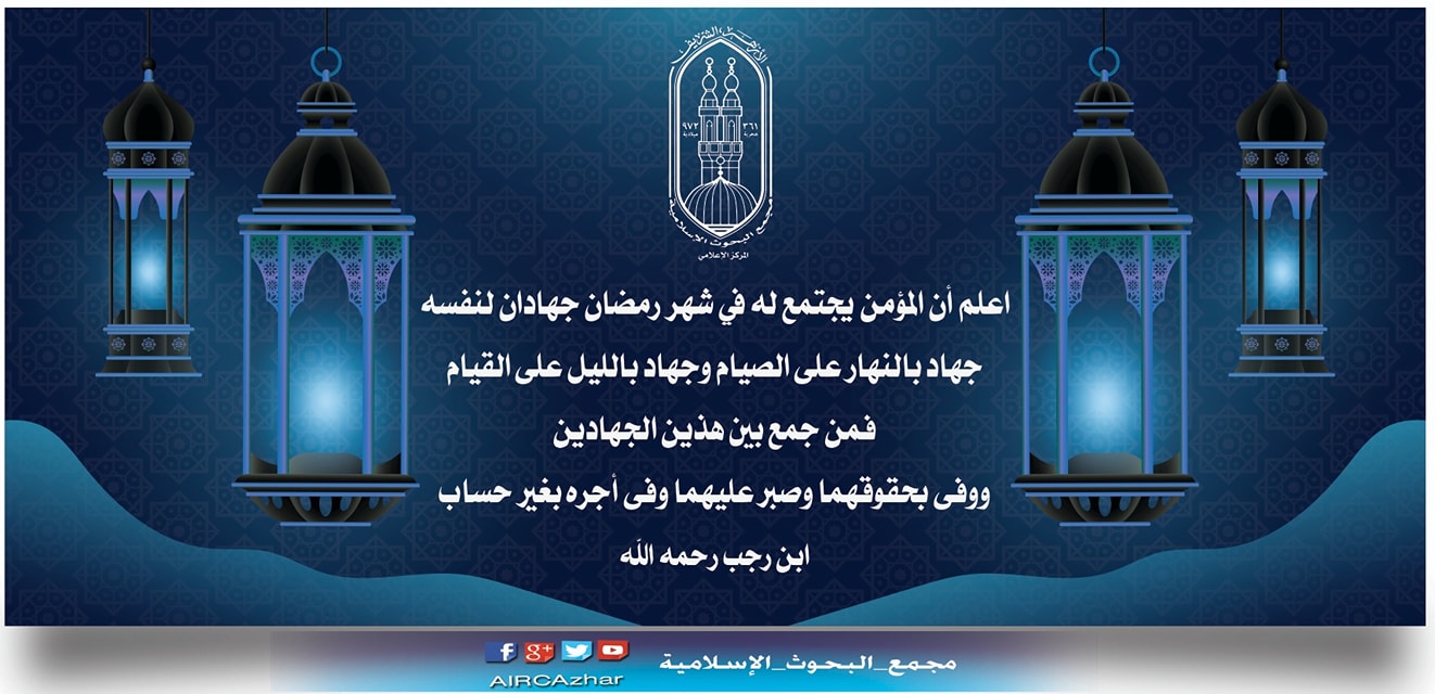وأكد مجمع البحوث الإسلامية، أن المؤمن يجتمع له في شهر رمضان جهادان لنفسه: جهاد بالنهار على الصيام، وجهاد بالليل على القيام، فمن جمع بين هذين الجهادين ووفى بحقوقهما وصبر عليهما وفّى أجره بغير حساب (ابن رجب رحمه الله).
