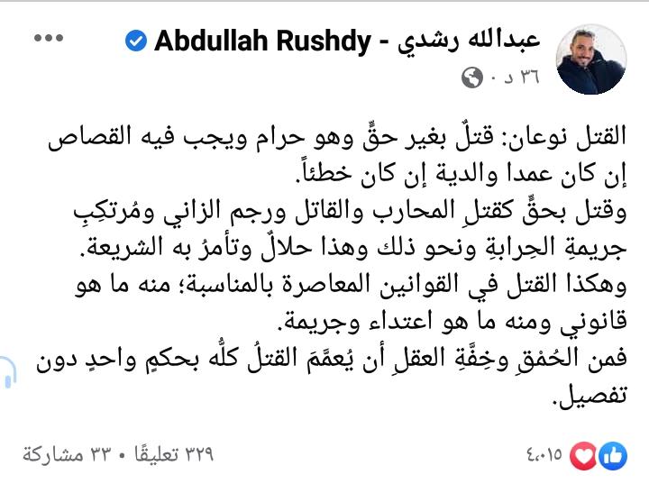 وأضاف، رشدي، في منشور له على صفحته الرسمية بموقع التواصل الاجتماعي فيس بوك: «وهكذا القتل في القوانين المعاصرة بالمناسبة؛ منه ما هو قانوني ومنه ما هو اعتداء وجريمة؛ فمن الحُمْقِ وخِفَّةِ العقلِ أن يُعمَّمَ القتلُ كلُّه بحكمٍ واحدٍ دون تفصيل».