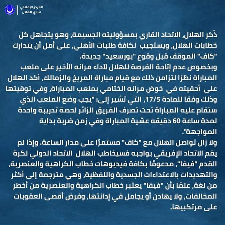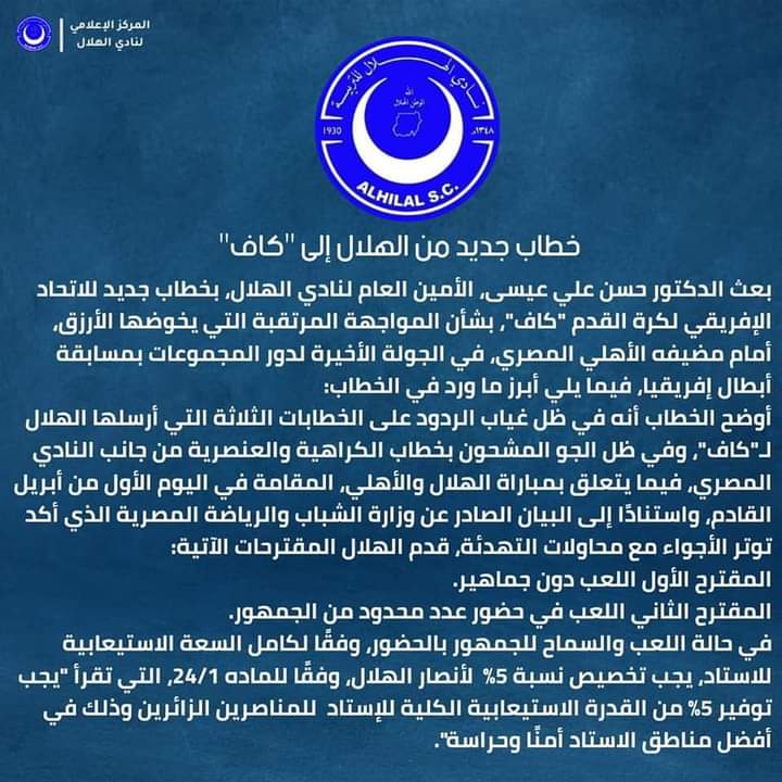 طلب مجلس إدارة نادي الهلال السوداني خوض المباراة المرتقبة والحاسمة أمام النادي الأهلي بدون حضور جماهيري، ومن المقرر إقامة المباراة يوم السبت المقبل في تمام الساعة التاسعة مساءً، على ملعب القاهرة الدولي