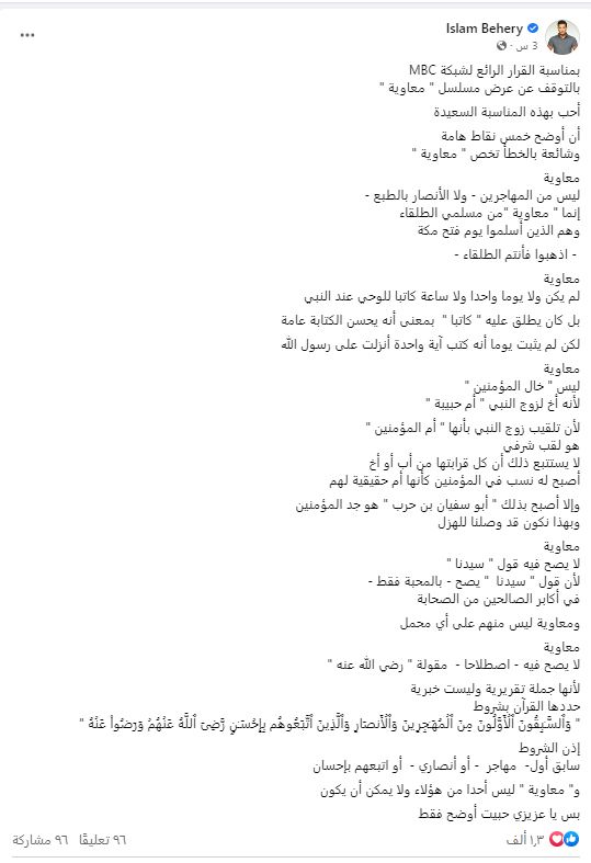 قال إسلام بحيري، الباحث والمفكر المصري: «إنه بمناسبة القرار الرائع لشبكة MBC بالتوقف عن عرض مسلسل (معاوية)، أود بهذه المناسبة السعيدة أن أوضح خمس نقاط هامة وشائعة بالخطأ تخص معاوية بن أبي سفيان».