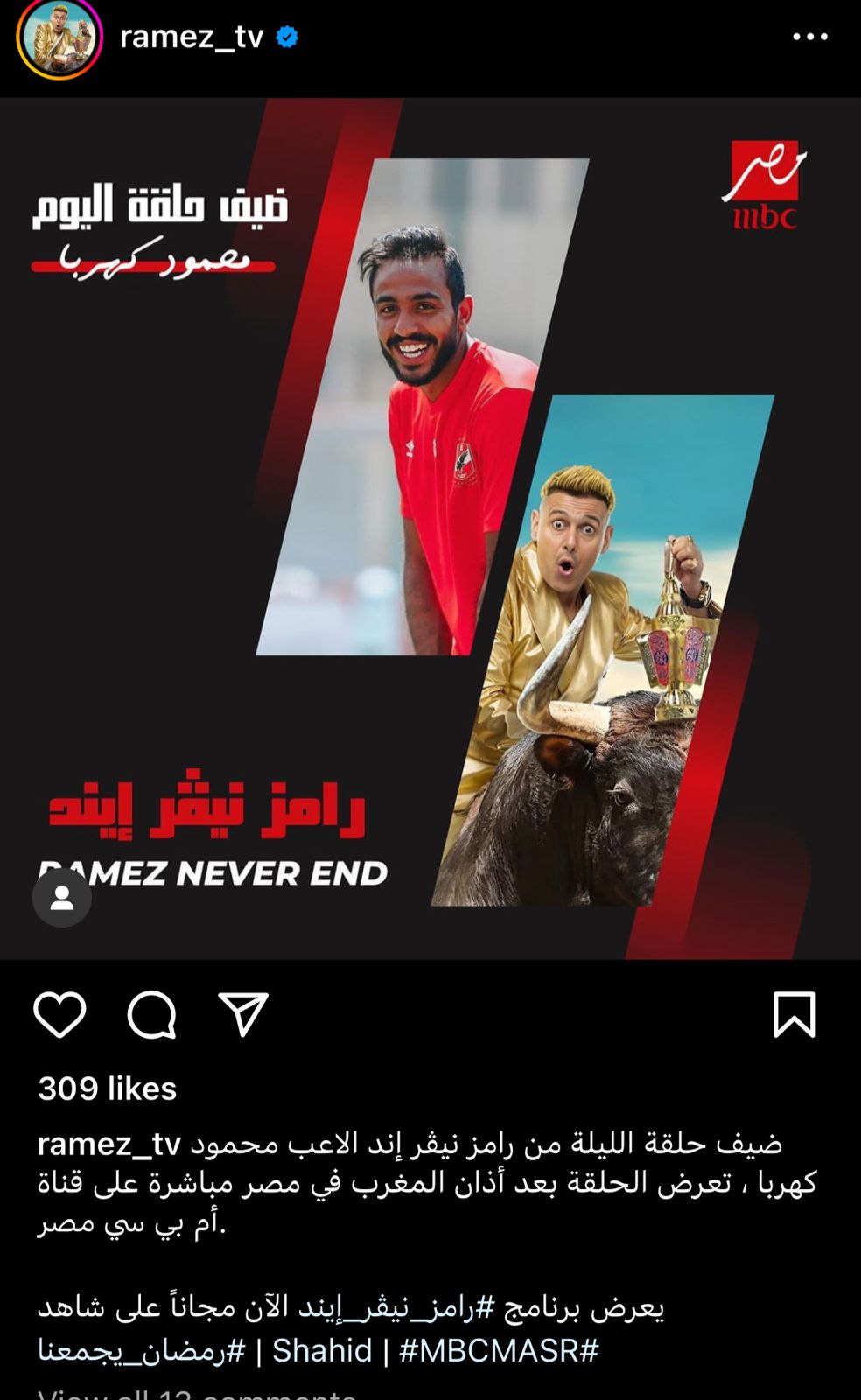 وكشف رامز جلال عبر حسابه بموقع تبادل الصور والفيديوهات انستجرام عن استضافة اللاعب محمود عبد المنعم كهربا لاعب النادي الأهلي في الحلقة الخامسة من رامز نيفر إند.