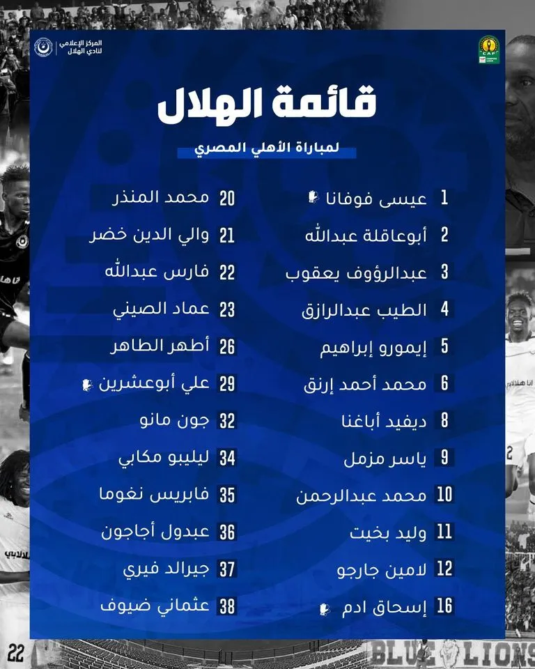 أعلن فلوران إيبينيجي المدير الفني لفريق الهلال السوداني، قائمة فريقه المتجهة ظهر اليوم إلى القاهرة، لملاقاة النادي الأهلي، وذلك في ختام منافسات دور المجموعات ببطولة دوري أبطال إفريقيا للموسم الحالي 2022/2023.