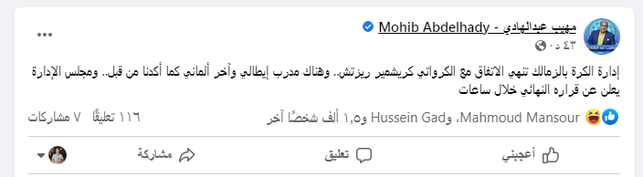 وكتب الإعلامي مهيب عبد الهادي مقدم برنامج اللعيب على إم بي سي: «إدارة الكرة بالزمالك تنهي الاتفاق مع الكرواتي كريشمير ريزتش.. وهناك مدرب إيطالي وآخر ألماني كما أكدنا من قبل.. ومجلس الإدارة يعلن عن قراره النهائي خلال ساعات».