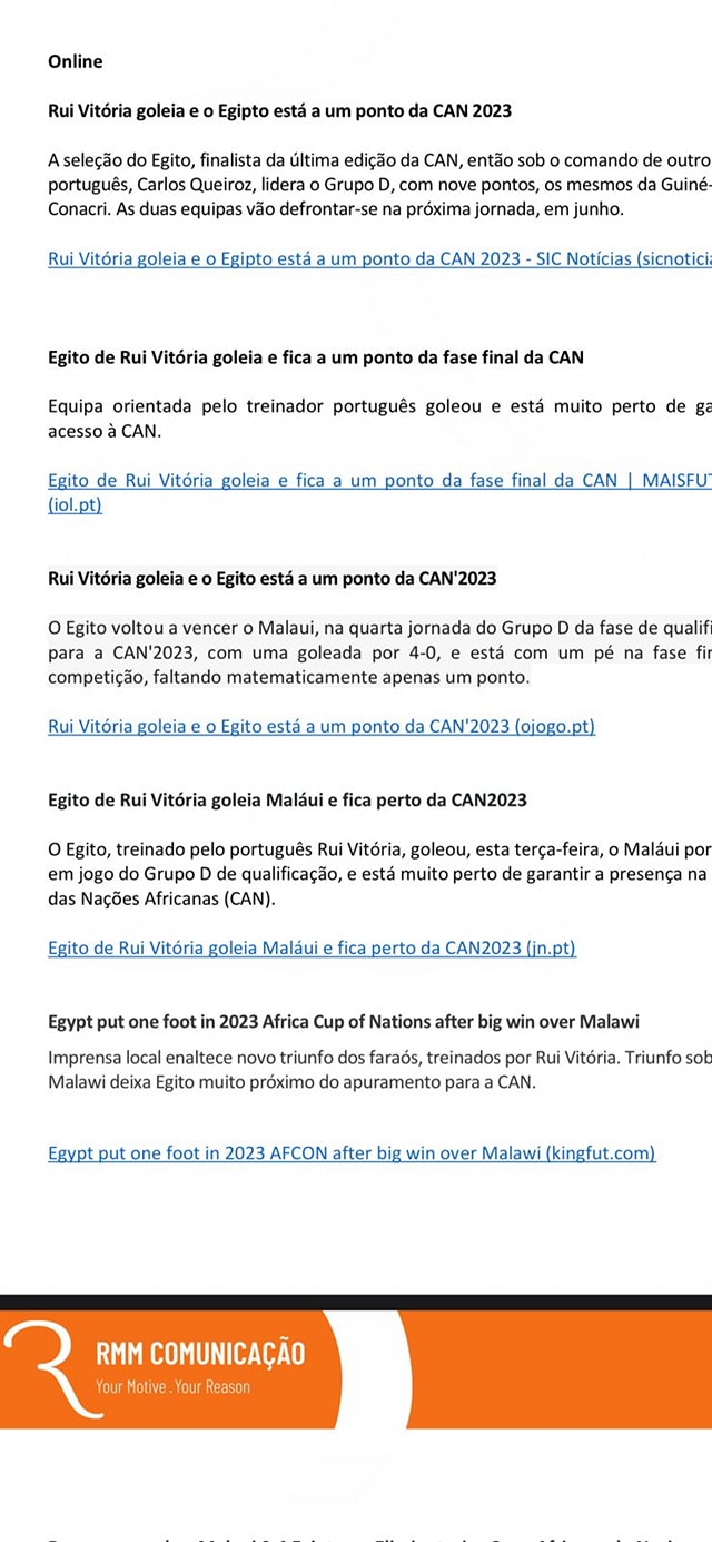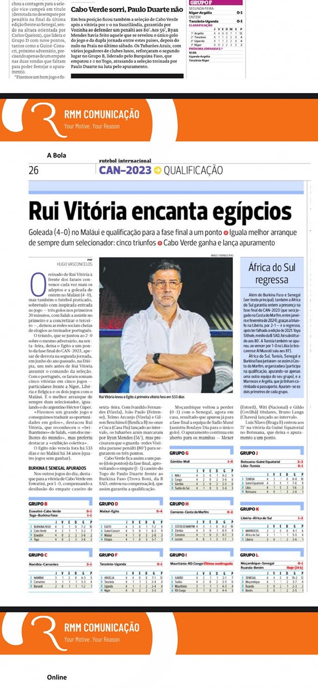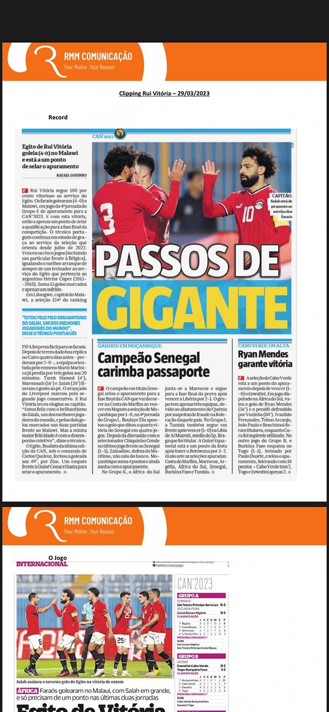 وقالت صحيفة ريكورد البرتغالية أن روي فيتوريا يخطو خطوات عملاقة مع منتخب مصر بنسبة فوز 100٪ منذ توليه المهمة، بينما قالت صحيفة أبولا البرتغالية أن روي فيتوريا أسعد المصريين بعد الفوز على منتخب مالاوي فى تصفيات أمم إفريقيا.