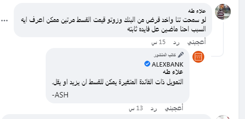 ورد موظف بنك الاسكندرية في تعليق على الشكوى المقدمة قائلاُ: "التمويل ذات الفائدة المتغيرة يمكن للقسط أن يزيد أو يقل".