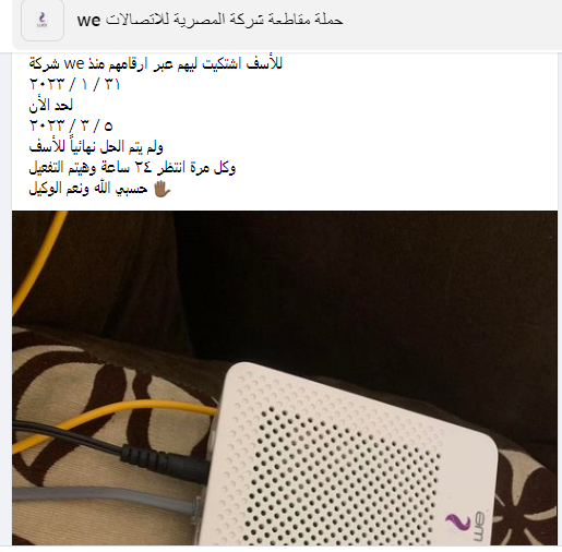 قال أحد عملاء المصرية للاتصالات في منشور عبر موقع "فيسبوك"،: "شركة we للأسف اشتكيت ليهم عبر ارقامهم منذ 31 / ١ / ٢٠٢٣ ولم يتم الحل نهائياً للأسف".