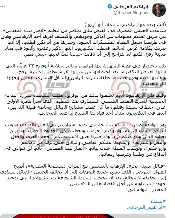 سلط رجل الأعمال ورئيس مجلس إدارة «العرجاني جروب»، الشيخ إبراهيم العرجانى، الضوء على ذكى استشهاد مها إبراهيم سليمان سلام أبو قريع، إحدى شهداء القبائل السيناوية في الحرب ضد الإرهاب، والتى قدمت نموذج فى التضحية من أجل الوطن والحفاظ عليه من براثن الإرهاب والخارجين عن القانون.