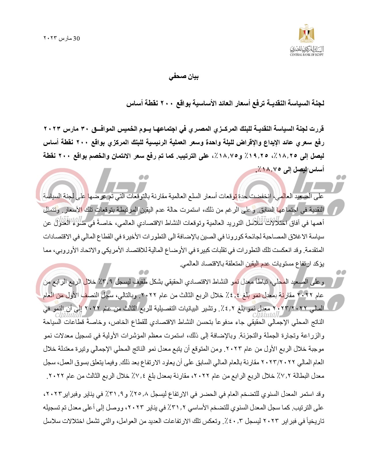 أعلنت لجنة السياسة النقدية بـ البنك المركزي المصري، في اجتماعها اليوم الخميس 30 مارس 2023، رفع أسعار الفائدة على الإيداع والإقراض لليلة واحدة، وسعر العملية الرئيسية لـ البنك المركزي بمقدار 2% عند 18.25% و19.25% و18.75%، على الترتيب.