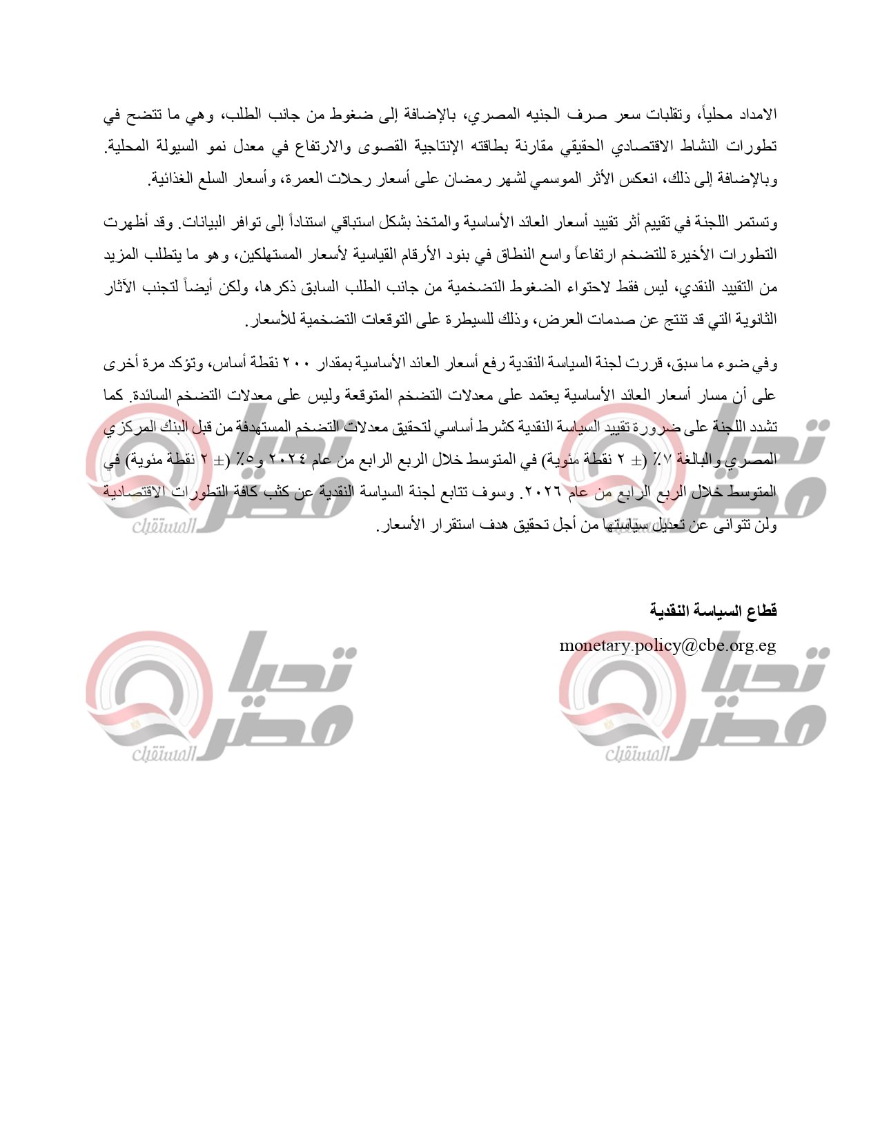 البنك المركزى يشرح مبررات رفع أسعار الفائدة بنسبة 2%