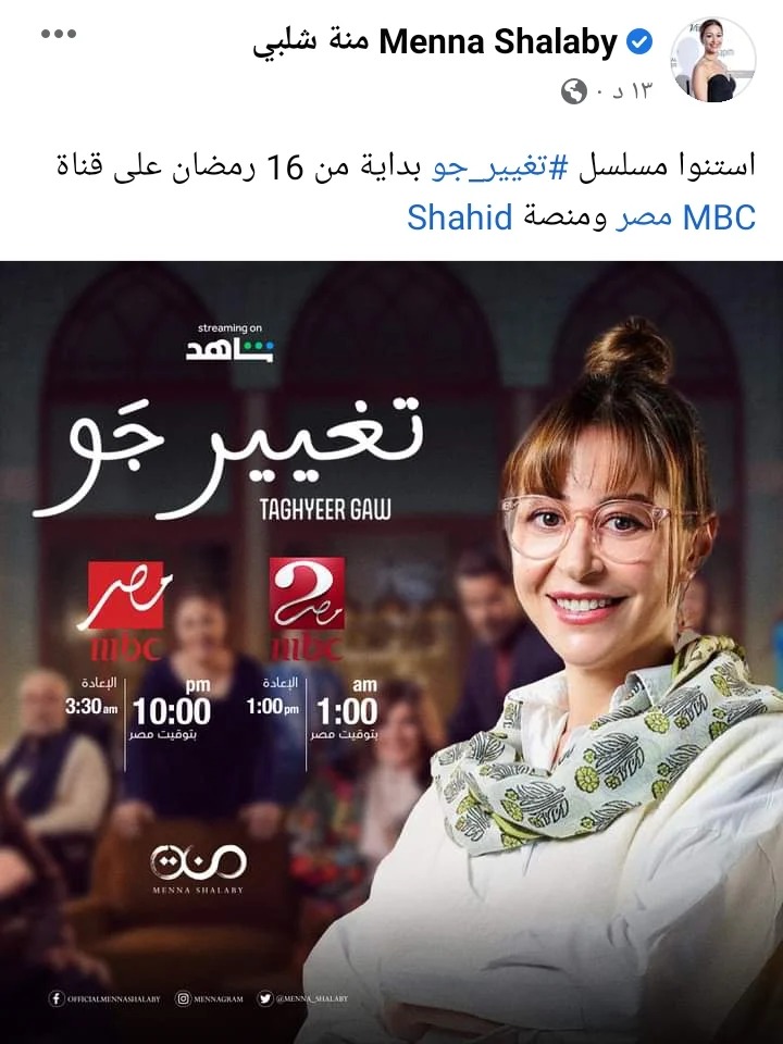 يبدأ 16 رمضان.. مواعيد عرض مسلسل تغيير جو لـ منة شلبي