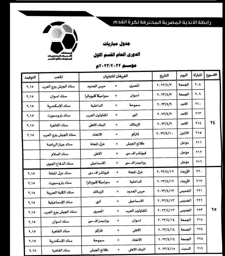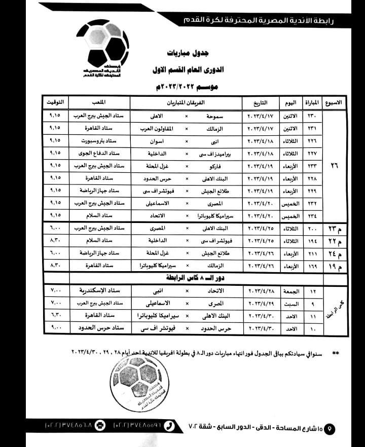 أعلنت رابطة الأندية برئاسة أحمد دياب بالتنسيق مع عامر حسين عضو اتحاد الكرة و المشرف علي المسابقات مواعيد مباريات الجولة ٢٤ و ٢٥ و ٢٦ ، و بعض المؤجلات الخاصة بالدوري ، كما تم تحديد مواعيد مباريات دور الثمانية من كأس الرابطة.