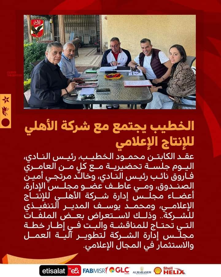 عقد محمود الخطيب رئيس النادي الأهلي، اليوم الاثنين جلسة تحضيرية مع كل من العامري فاروق نائب رئيس النادي، وخالد مرتجي أمين الصندوق، ومي عاطف عضو مجلس الإدارة، أعضاء مجلس إدارة شركة الأهلي للإنتاج الإعلامي، ومحمد يوسف المدير التنفيذي للشركة، وذلك لاستعراض بعض الملفات التي تحتاج للمناقشة والبت في إطار خطة مجلس إدارة الشركة، لتطوير آلية العمل والاستثمار في المجال الإعلامي.