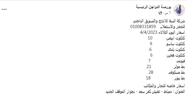 فيما كشفت إحدى الشركات والتي تسمى شركة السقا للانتاج والتسويق الداجني، عن أسعار الفراخ والكتاكيت والبيض اليوم الثلاثاء، والتي جاءت كالتالي: