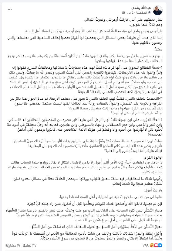 وأضاف رشدي، في منشور كتبه على صفحته الشخصية بموقع التواصل الاجتماعي فيس بوك: «إنما الذي حدث أنني طرقتُ بعض المسائل التي يتعصبُ لها أقوامٌ تعصبًا يُخالف المذهبية التي تعلمناها والتي يزعمون دفاعَهم عنها».