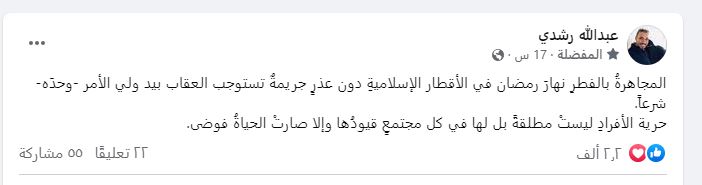 اعتبر الداعية واليوتيبر عبد الله رشدي، المجاهرة بالفطر جريمة تستوجب العقاب؛ قائلًا: «المجاهرةُ بالفطرِ نهارَ رمضان في الأقطار الإسلاميةِ دون عذرٍ جريمةٌ تستوجب العقاب بيد ولي الأمر – وحدَه - شرعًا؛ حرية الأفرادِ ليستْ مطلقةً بل لها في كل مجتمعٍ قيودُها وإلا صارتْ الحياةُ فوضى».