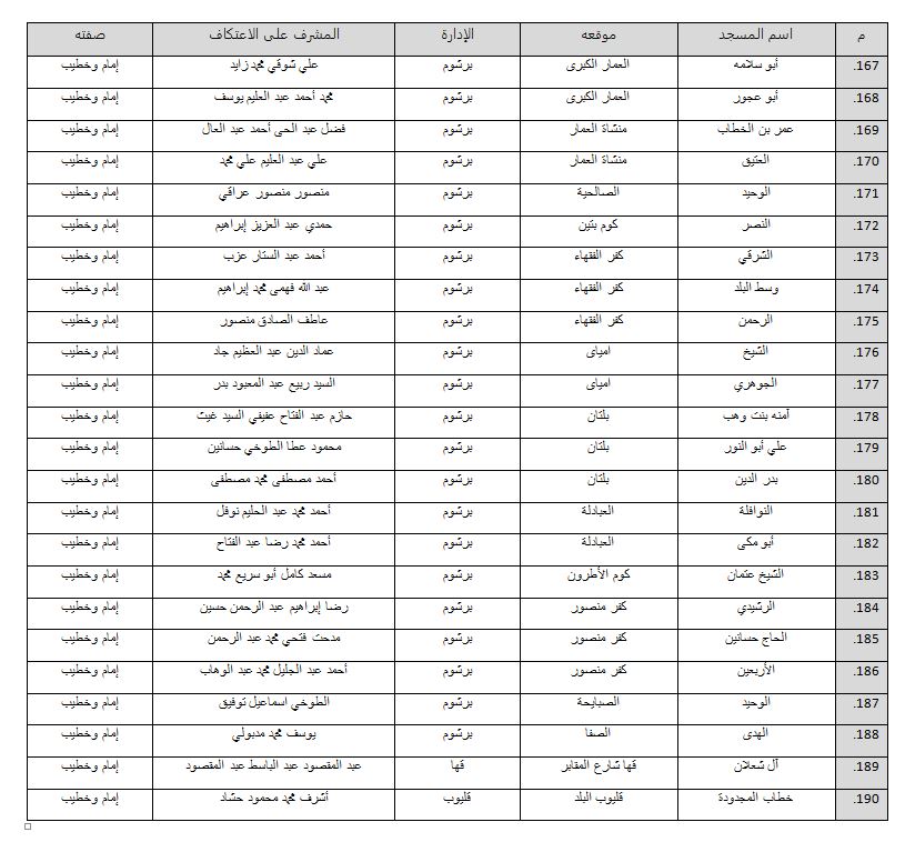 • على جميع السادة المفتشين ومديري الإدارات والمديريات متابعة كل شئون الاعتكاف بدءًا من تسجيل المعتكفين إلى إتمام عملية الاعتكاف كل فيما يخصه.