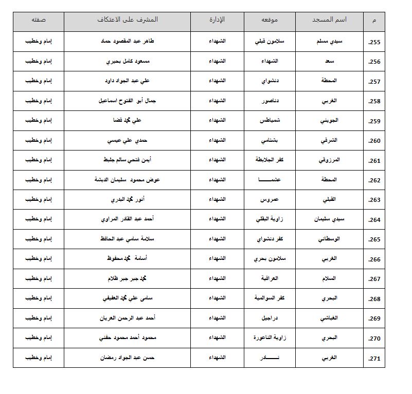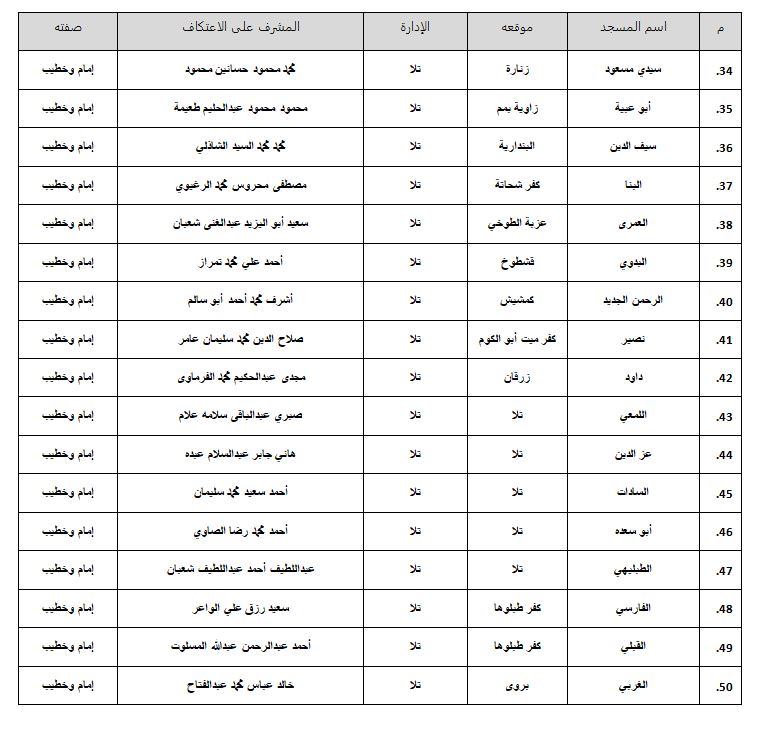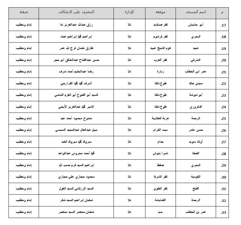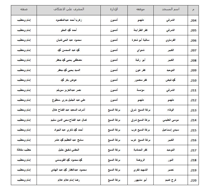 • على جميع السادة المفتشين ومديري الإدارات والمديريات متابعة كل شئون الاعتكاف بدءًا من تسجيل المعتكفين إلى إتمام عملية الاعتكاف كل فيما يخصه.