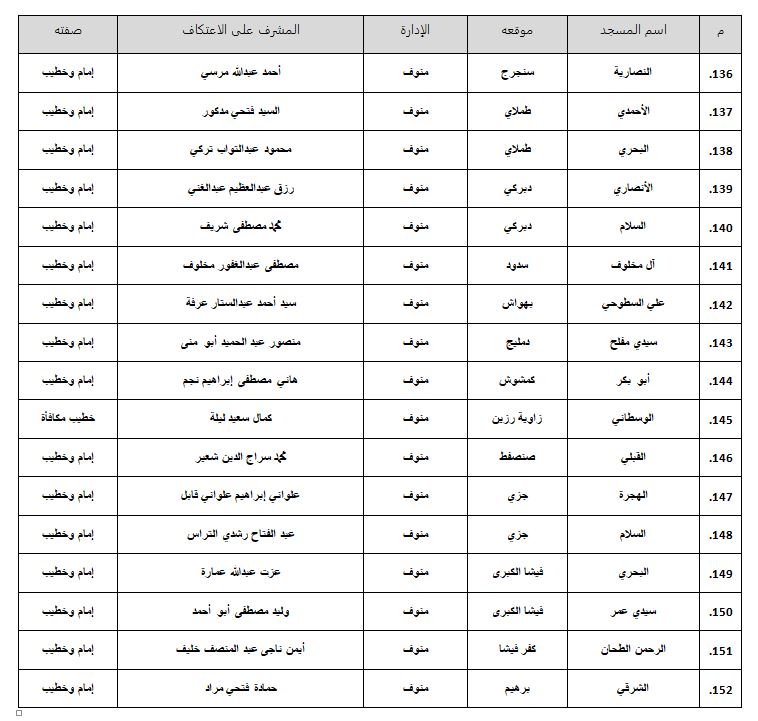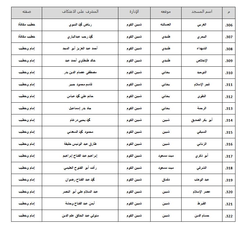 وأعلنت وزارة الأوقاف أسماء المساجد المسموح بالاعتكاف فيها داخل محافظة المنوفية، وهى كالتالي: