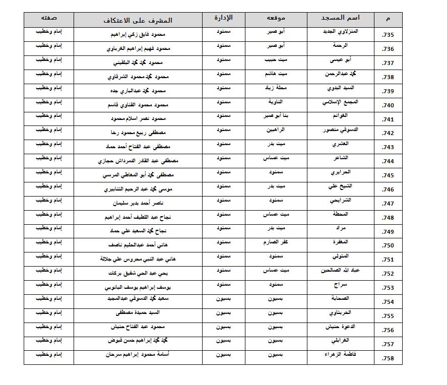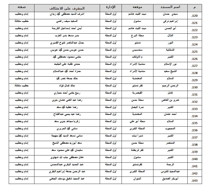 وأعلنت وزارة الأوقاف أسماء المساجد المسموح بالاعتكاف فيها داخل محافظة الغربية، وهى كالتالي: