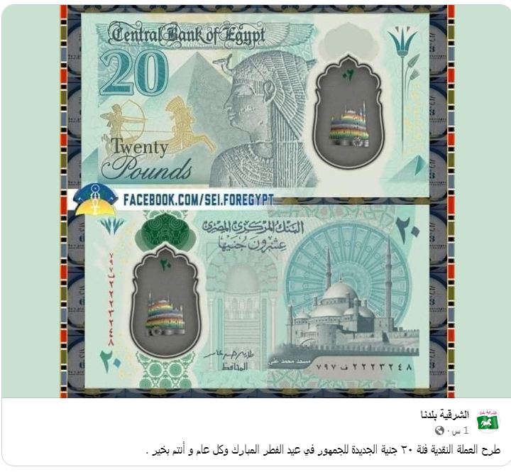 وفي إطار طرح العشرين جنيه البلاستيك الجديدة، نشرت صفحة على موقع التواصل الاجتماعي فيس بوك باسم "الشرقية بلدنا"، منشورًا تقول فيه: "طرح العملة النقدية فئة ٢٠ جنية الجديدة للجمهور في عيد الفطر المبارك وكل عام و أنتم بخير".