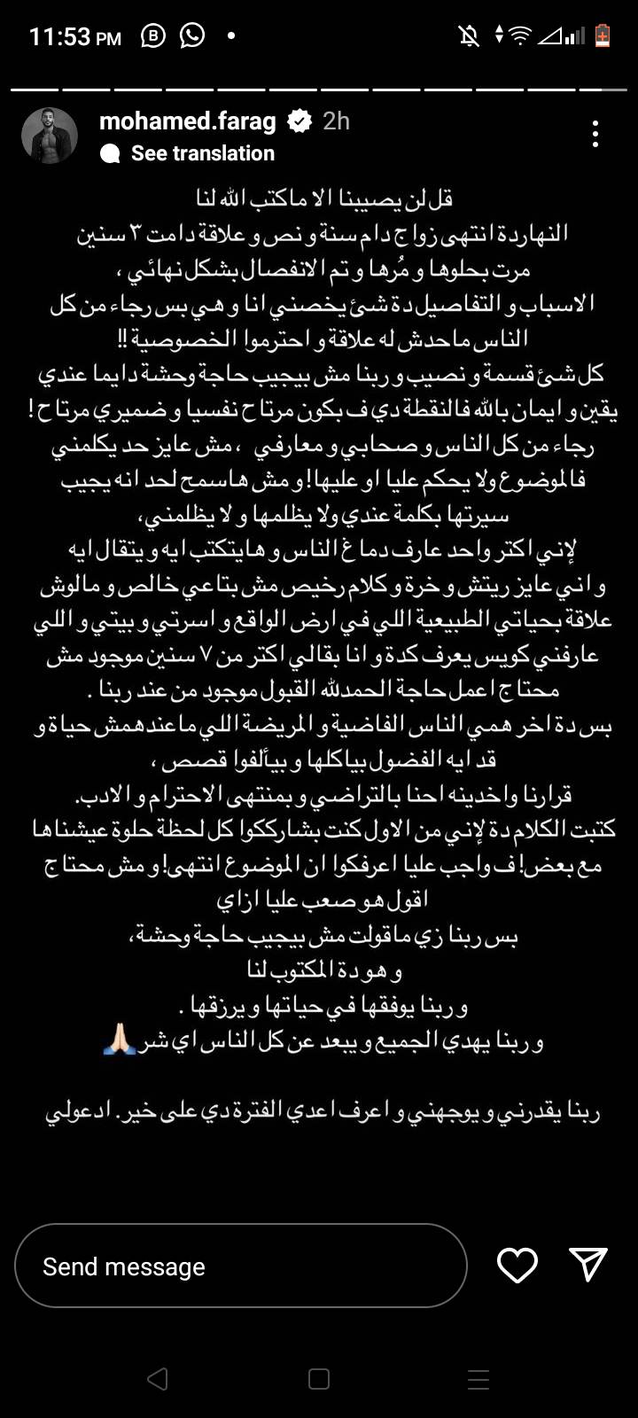 وأضاف: كتبت الكلام دة لإني من الأول كنت بشارككوا كل لحظة حلوة عيشناها مع بعض وواجب عليا اعرفكوا أن الموضوع انتهى و مش محتاج اقول هو صعب عليا ازاي بس ربنا زي ماقولت مش بيجيب حاجة وحشة، و هو دة المكتوب لنا و ربنا يوفقها في حياتها و يرزقها.