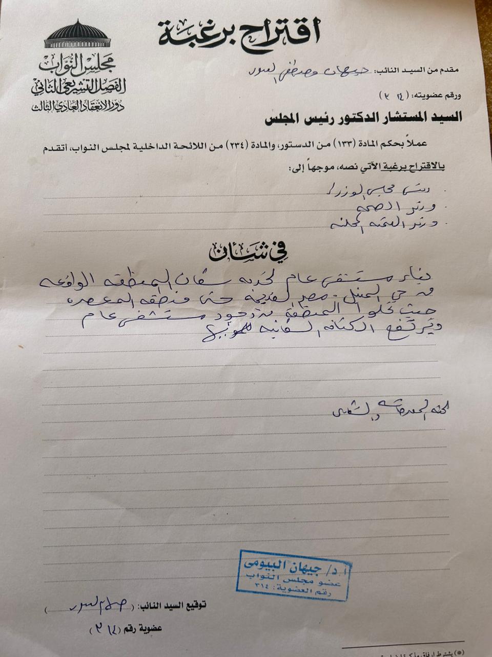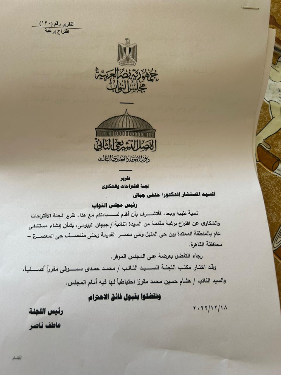 وكانت قد تقدمت النائبة جيهان البيومي عضو لجنة التعليم بمجلس النواب، باقتراح برغبة موجه إلى رئيس مجلس الوزراء ووزيري الصحة والتنمية المحلية في شأن بناء مستشفى عام لخدمة سكان المنطقة الواقعة الممتدة بين حي المنيل وحي مصر القديمة وحتى منتصف المعصرة- محافظة القاهرة، حيث تخلو من المنطقة من وجود مستشفى عام ويرتفع الكثافة السكانية بها.