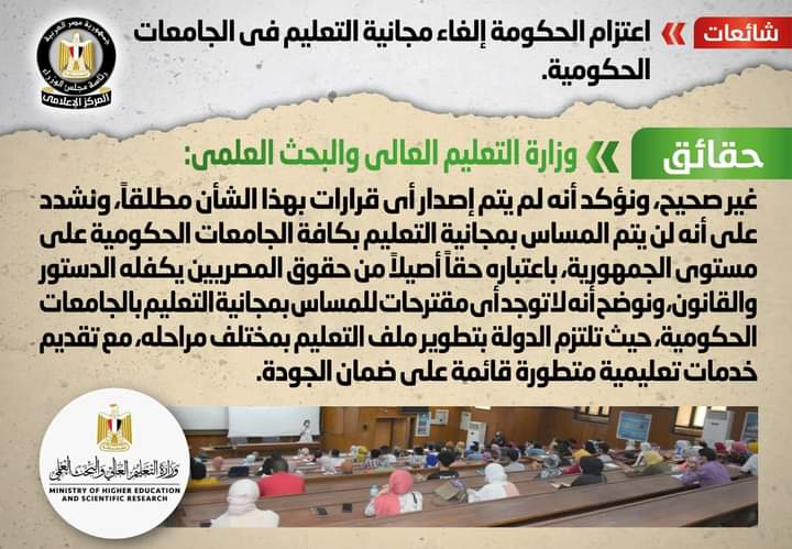 تداولت بعض المواقع الإلكترونية وصفحات التواصل الاجتماعي أنباء بشأن اعتزام الحكومة إلغاء مجانية التعليم في الجامعات الحكومية، وقد قام المركز الإعلامي لمجلس الوزراء بالتواصل مع وزارة التعليم العالي والبحث العلمي، والتي نفت تلك الأنباء تماماً.
