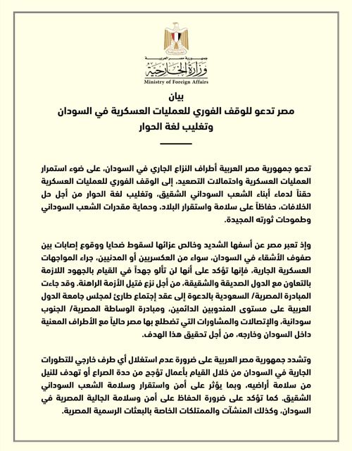 مصر تدعو للوقف الفوري للعمليات العسكرية في السودان وتغليب لغة الحوار