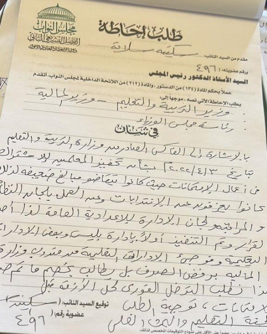 وطالبت سلامة بالتدخل الفوري لحل الأزمة قبل الامتحانات، وتوجيه الطلب للجنة التعليم والبحث العلمي.
