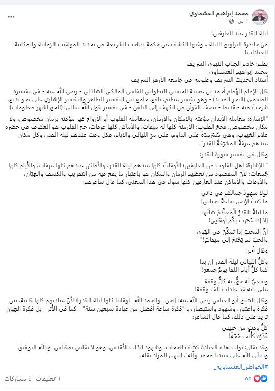 وقال الدكتور العشماوي، في منشور كتبه على صفحته الرسمية بموقع التواصل الاجتماعي فيس بوك: إن الإمام الهُمام أحمد بن عجيبة الحسني التطواني الفاسي المالكي الشاذلي - رضي الله عنه -، قال في تفسيره المسمى (البحر المديد) في تفسير قول الله تعالى «الحج أشهر معلومات»: الإشارة؛ معاملة الأبدان مؤقتة بالأمكان والأزمان، ومعاملة القلوب أو الأرواح غير مؤقتة بزمان مخصوص، ولا مكان مخصوص.